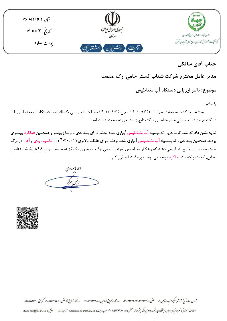 امکان کشاورزی با آب های شور تا EC 13000نسبت به نوع گیاه، کاهش ضریب تبدیل و افزایش بهره وری چشمگیر بخش کشاورزی، افزایش آب شوئی خاک های شور، کاهش مصرف آبیاری و کاهش مصرف کودهای شیمیایی، کاهش ملموس و چشمگیر دوره رشد گیاه، افزایش اکسیژن آب تا 10درصد، برد طولی و عرضی