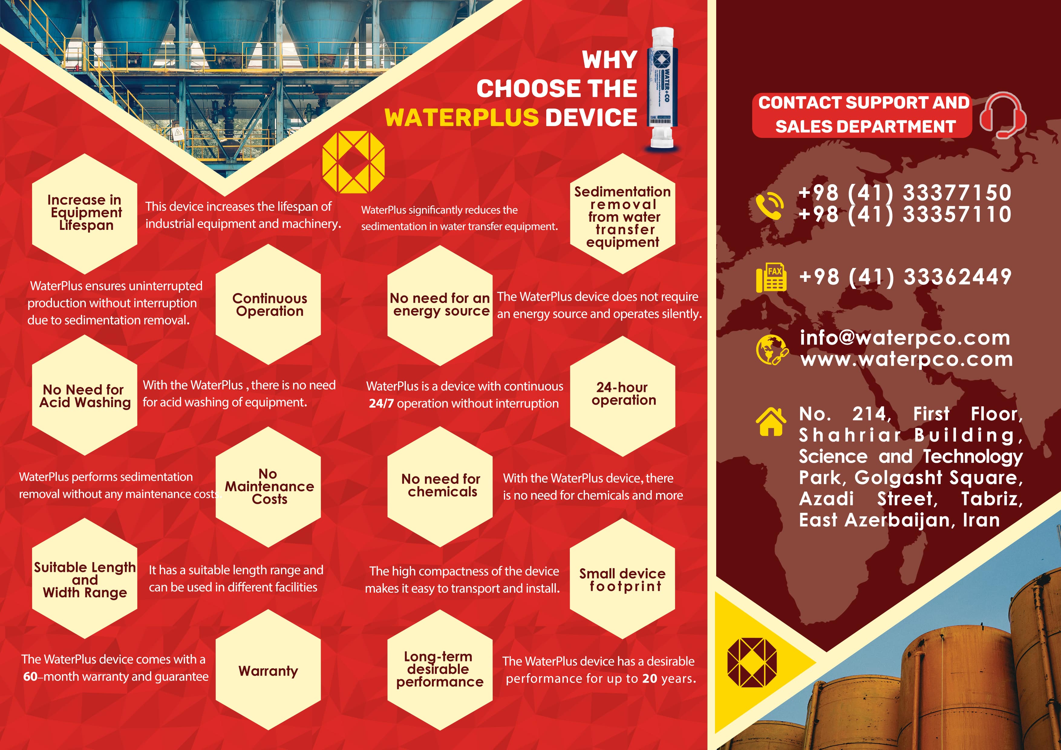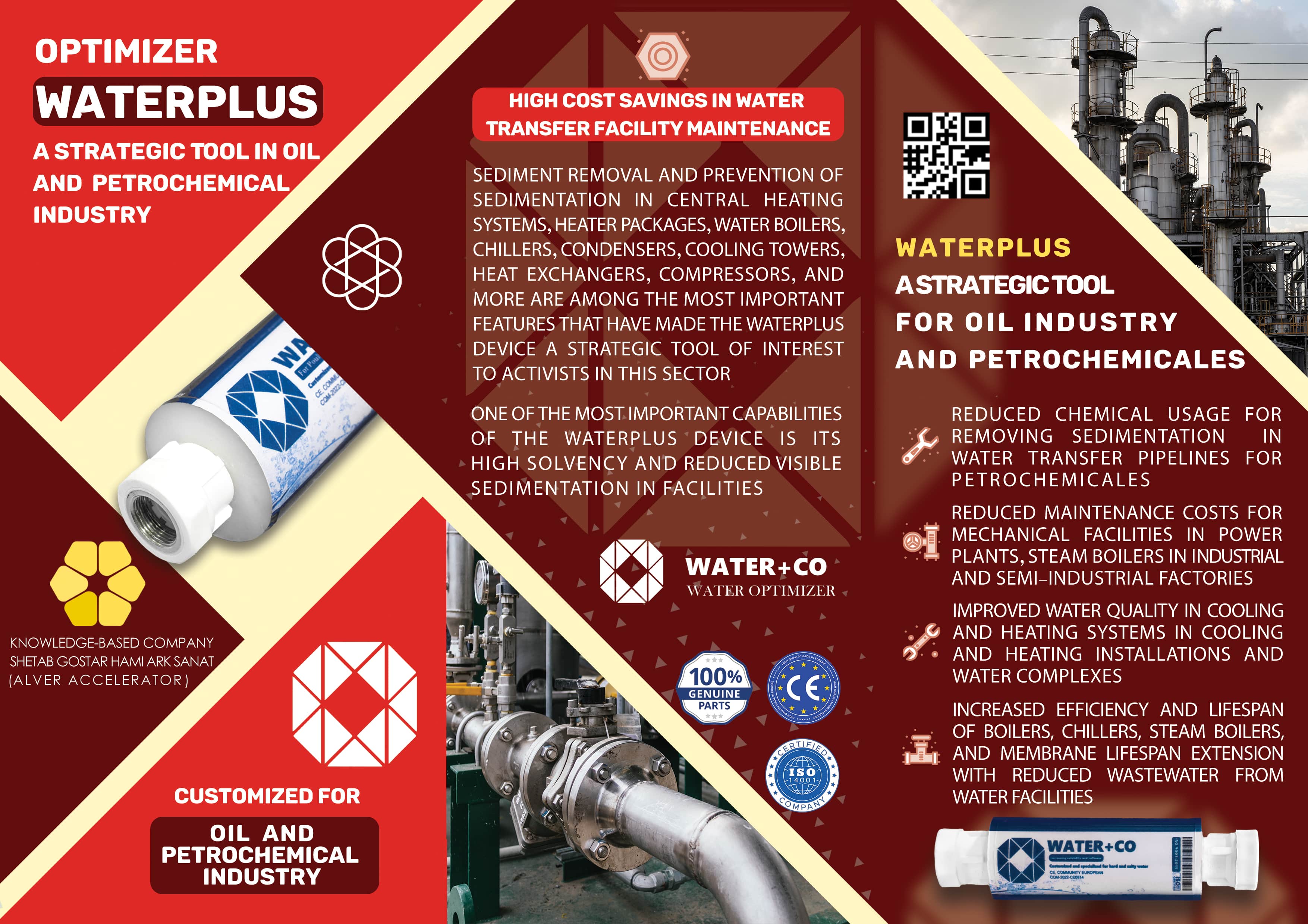 - Boiler: Waterplus (1) is installed at the inlet of the steam boiler and after the feed pump (feeder) and by increasing the solubility of water, it prevents sedimentation in high concentrations of about several thousand ppm.