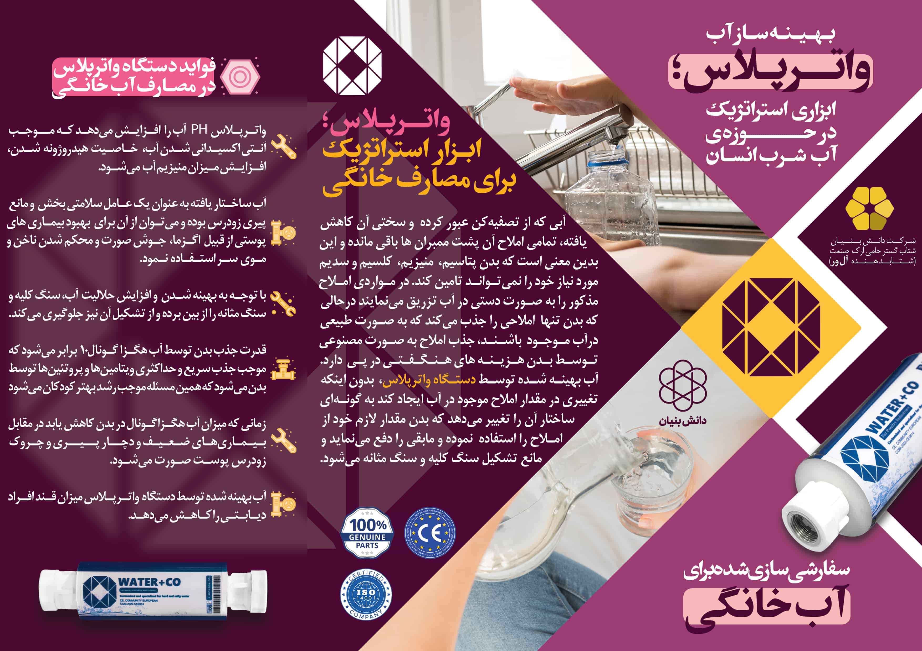 استفاده از دانش و فناوری سطح بالا؛ بدون اینکه تغییری در ماهیت اصلی آب مصرفی ایجاد نماید سبب شده است تا دستگاه بهینه ساز آب واترپلاس تاثیر شگرفی در حوزه های مختلف کارکردی اعم از صنعت، کشاورزی، دامداری، پرورش طیور و آبزیان، بهداشت و سلامت ایجاد نماید. با توجه به حوزه وسیع کاربرد آب و اهمیت کیفیت این مایع ارزشمند، دستیابی به ساختاری بهینه جهت ارتقای سطح کیفی و افزایش کارایی آن موفقیتی گرانبهاست که اکنون قابلیت عرضه به صورت وسیع را در سطح ملی دارا می باشد.