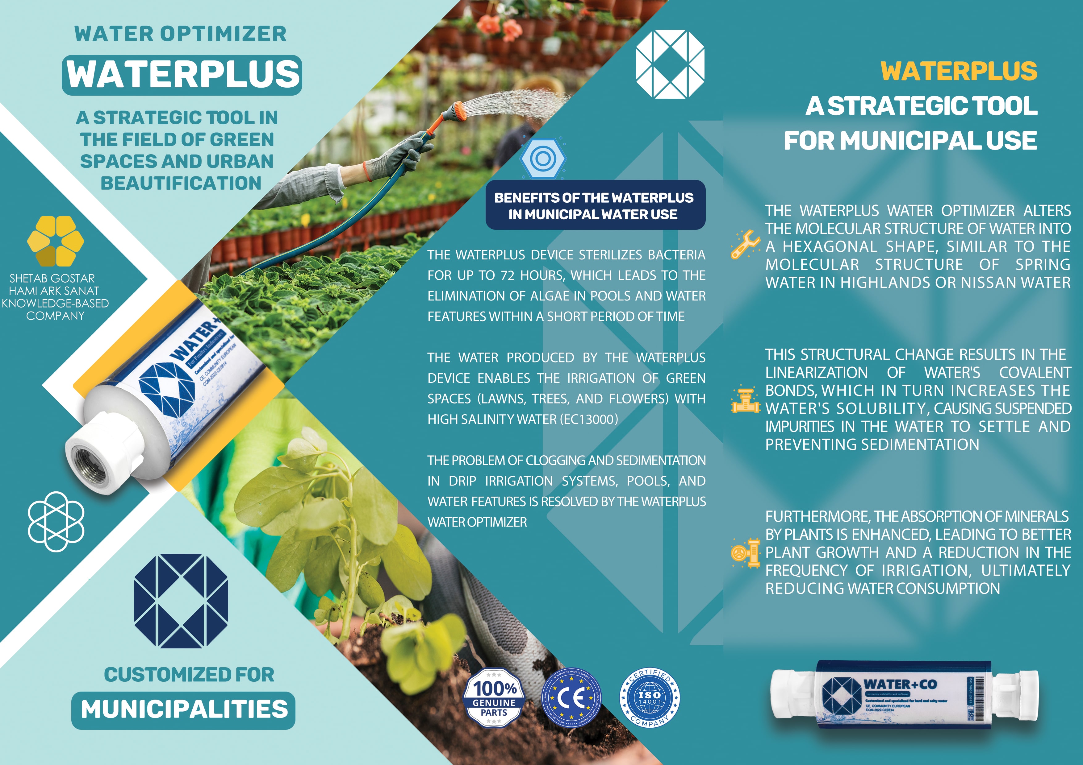 Considering the impossibility of using water with high EC and the critical situation of water in Iran and the world, the problem of supplying irrigation water to green spaces is faced with a problem that relies on the knowledge and power of the elite youth and the community of action, including "We can" we were able to take a big step towards improving the quality of people's lives and with the blessings of the Almighty God, we produced the Waterplus water optimization device, which solves the issue of municipal water supply.