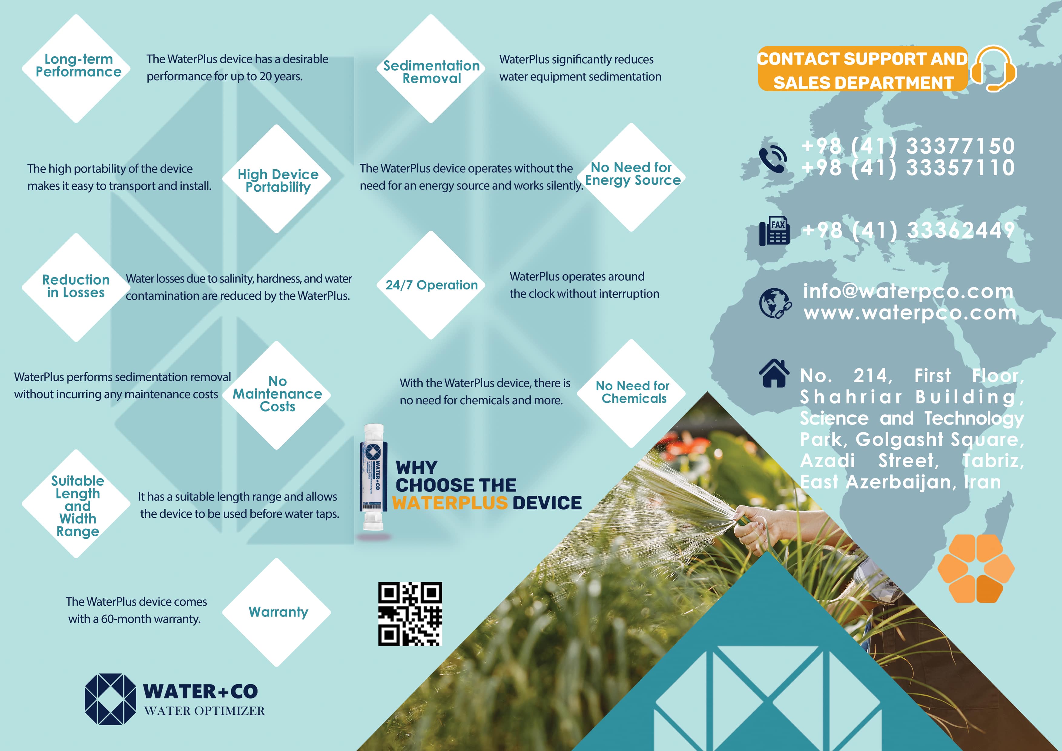 Using high-level knowledge and technology; Without changing the main nature of the water consumed, the Waterplus water optimizer has made a tremendous impact in various functional areas, including agriculture, animal husbandry, poultry and aquaculture, industry, health and health. Considering the wide field of water application and the importance of the quality of this valuable liquid, achieving an optimal structure to improve the quality level and increase its efficiency is a precious success, which now has the ability to be widely supplied at the national level.