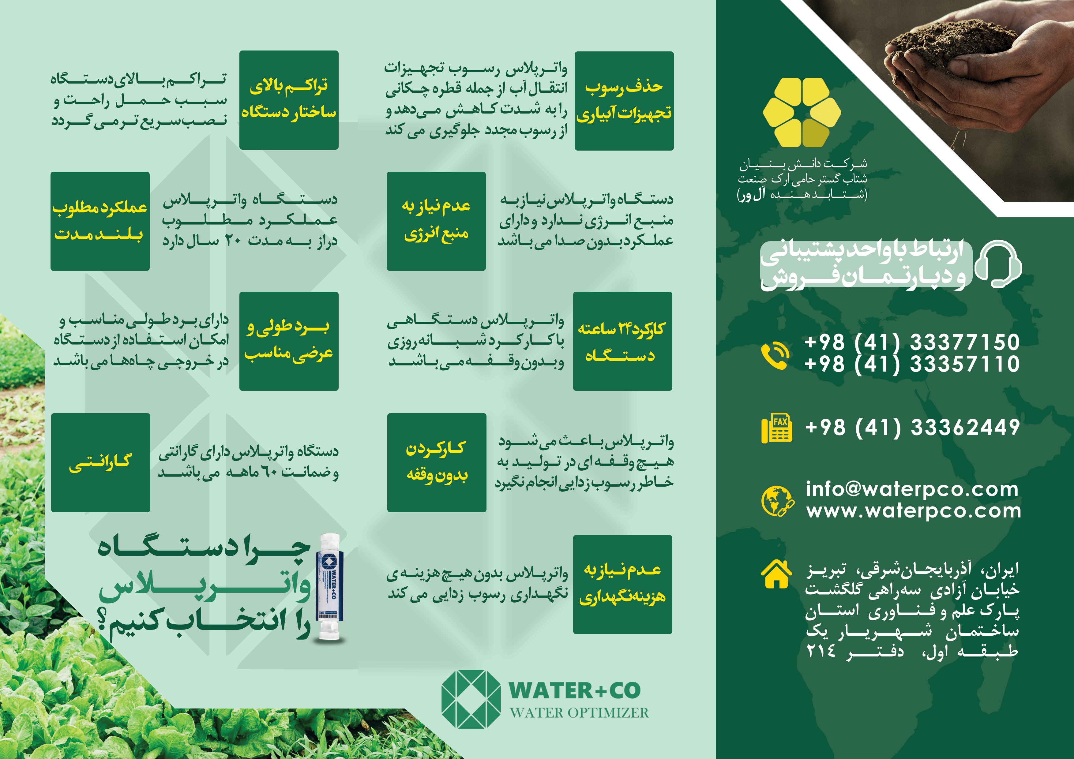 با توجه به کمبود منابع آب در کشور و اهمیت آن، استفاده صحیح از منابع موجود و کاربرد آب های نامتعـارف یکی از مهمترین اهداف بخش کشاورزی میباشد. یکی از چالشهای دیرینه در کشـاورزی مقـابـله با آب شور بـوده و اسـت. کاربرد آب شور سبـب خـطـرات محیط زیستی همچـون: لب سوختگی برگ، خشکیدگی شاخه، کلوخه ای شدن خاک، سمی شدن خاک، افت حاصلخیزی خـاک به دلیـل شوری و مانـدابی شـدن، آلودگی منابع آب توسـط نمـک ها، تخـریب اکوسیستم ها و به مخاطـره افتادن سلامت عموم به دلیـل آب آلـوده. اصلاح آب آبیــاری و رفـع شـوری آب تـوســط دسـتـگــاه واترپـلاس و بـدون اسـتـفـاده از مـواد شـیـمیـایی و سمی، موجب کـاهش کاربرد نیاز آبی و کود و سم شده و خاک به مرور اصـلاح می گردد.