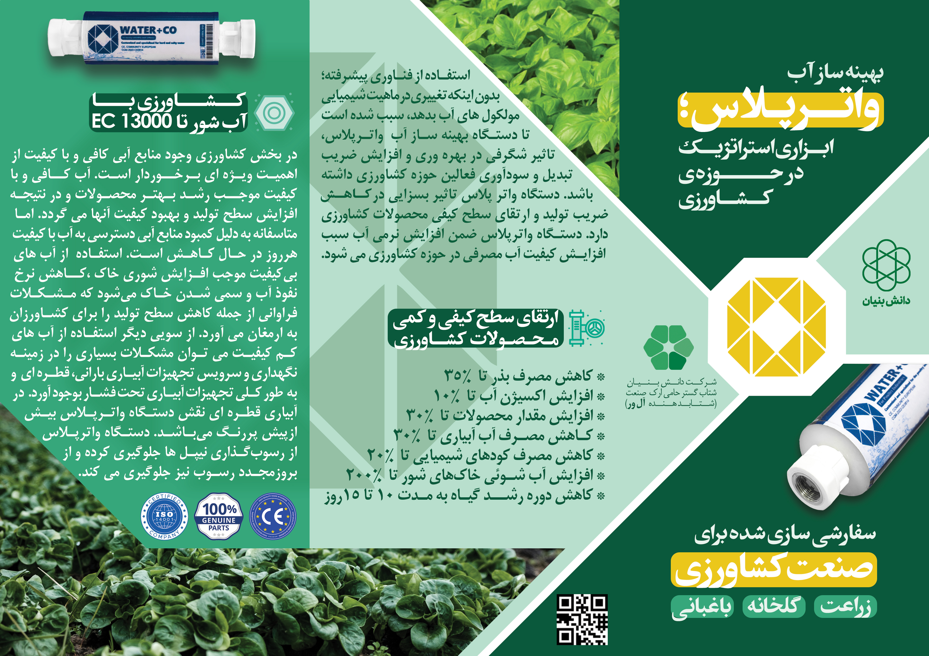 با توجه به ممکن نبودن کشاورزی با آب های با EC بالا و وضعیت بحرانی آب در ایران و دنیا، مسئله تامین آب برای کشاورزی و شرب با مشکل روبهرو می شود که با تکیه بر دانش و نیروی جوانان نخبه و جامعه عمل پوشاندن به جمله "ما میتوانیم" توانستیم گامی بزرگ در راستای بهبود بخشی به کیفیت زندگی مردم برداریم و با عنایات پروردگار متعال دستگاه بهینه ساز آب واترپلاس را تولید کردیم که مسئله تامین آب برای کشاورزی را مرتفع می نماید.
