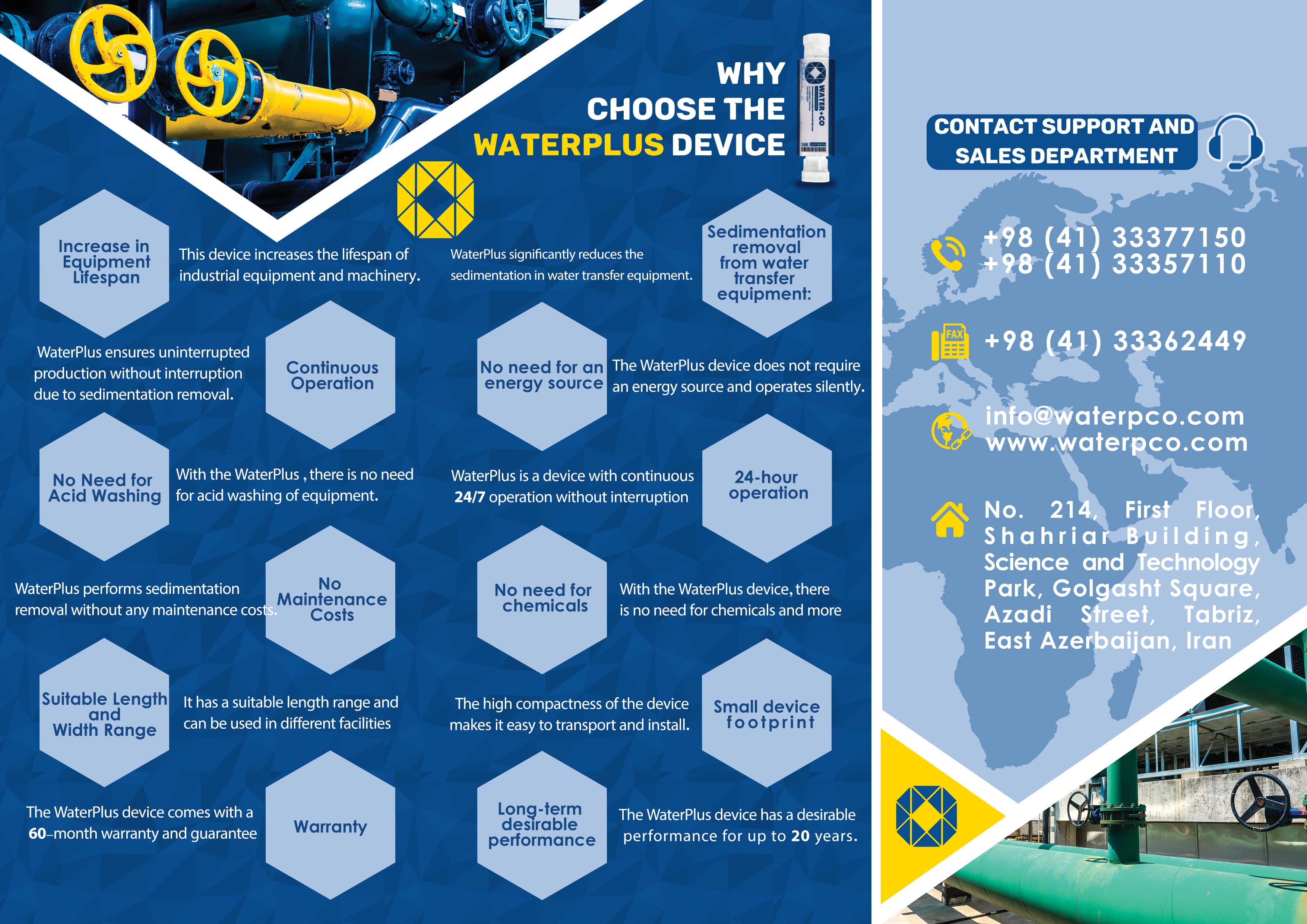 - Boiler: Waterplus (1) is installed at the inlet of the steam boiler and after the feed pump (feeder) and by increasing the solubility of water, it prevents sedimentation in high concentrations of about several thousand ppm.