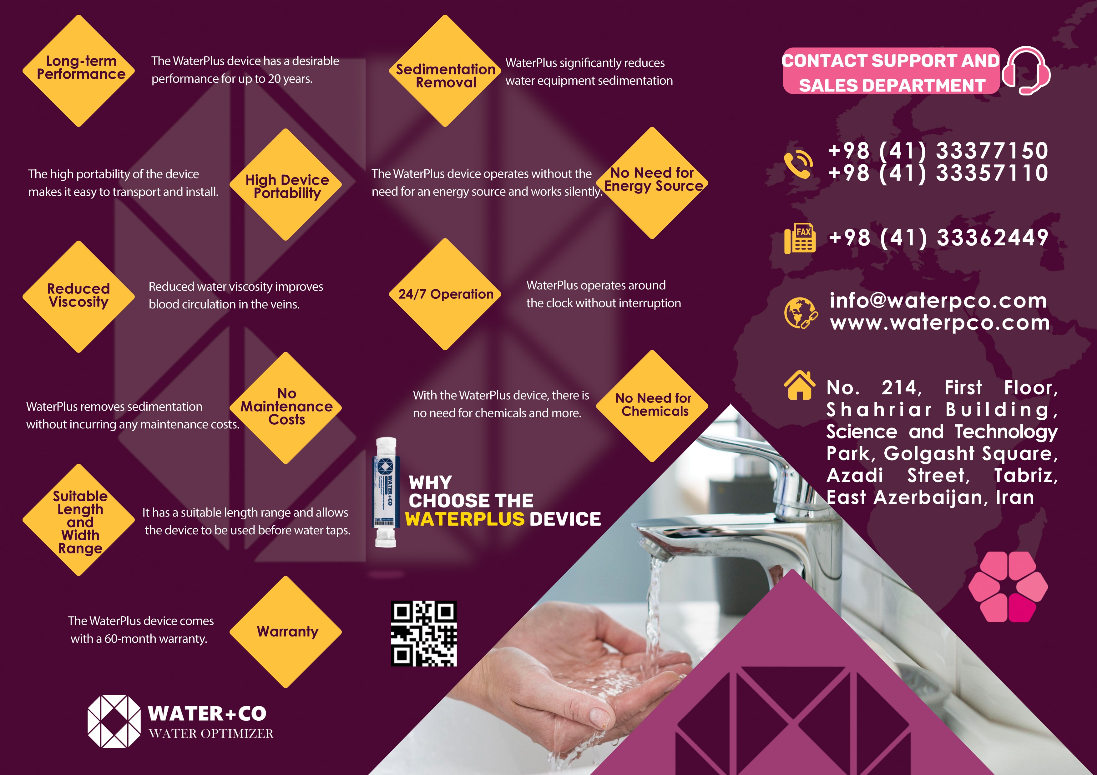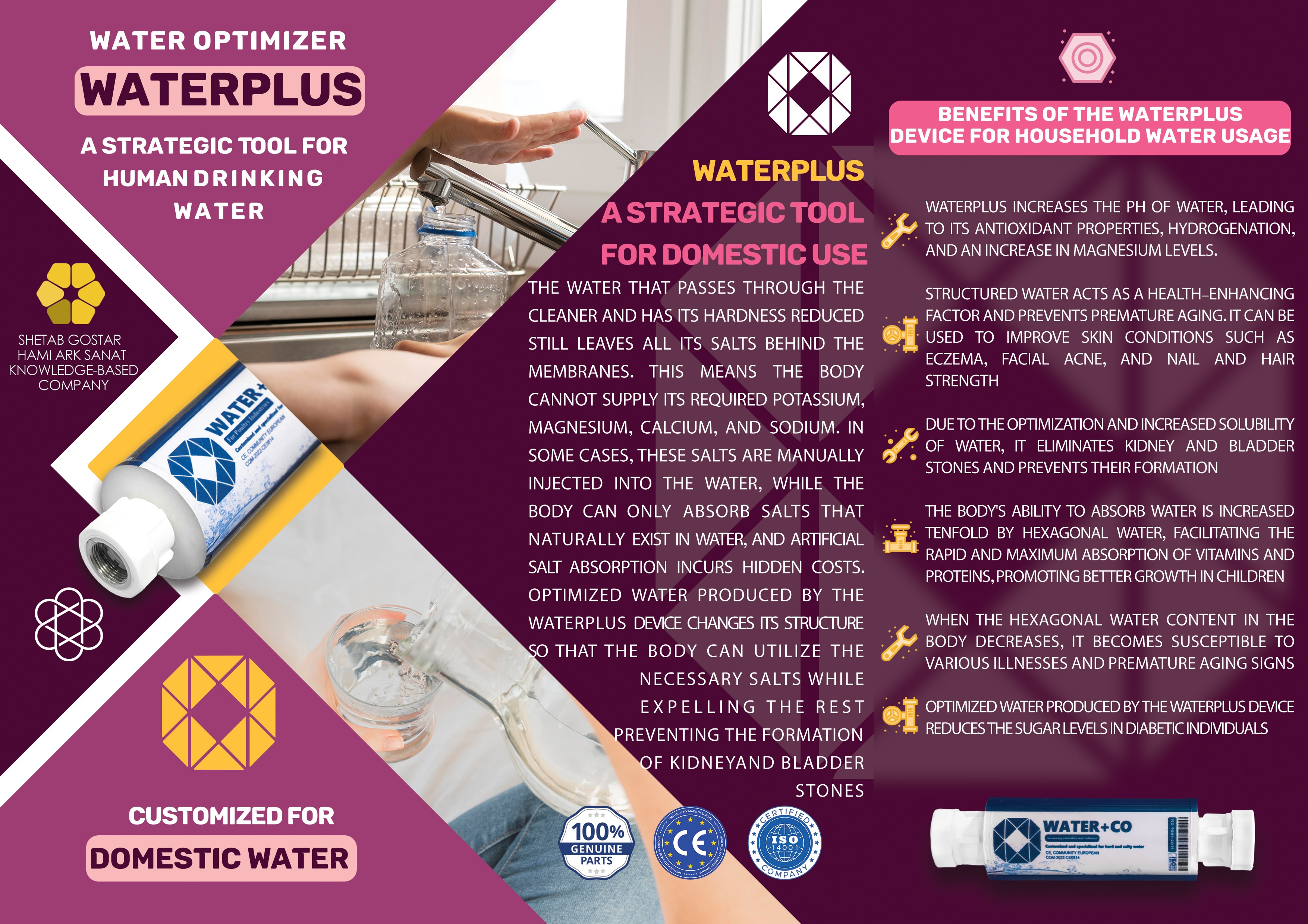 Using high-level knowledge and technology; Without changing the main nature of the water consumed, the Waterplus water optimization device has made a tremendous impact in various functional areas, including industry, agriculture, animal husbandry, poultry and aquatic farming, health and health. Considering the wide field of application of water and the importance of the quality of this valuable liquid, achieving an optimal structure to improve the quality level and increase its efficiency is a precious success, which now has the ability to be widely supplied at the national level.