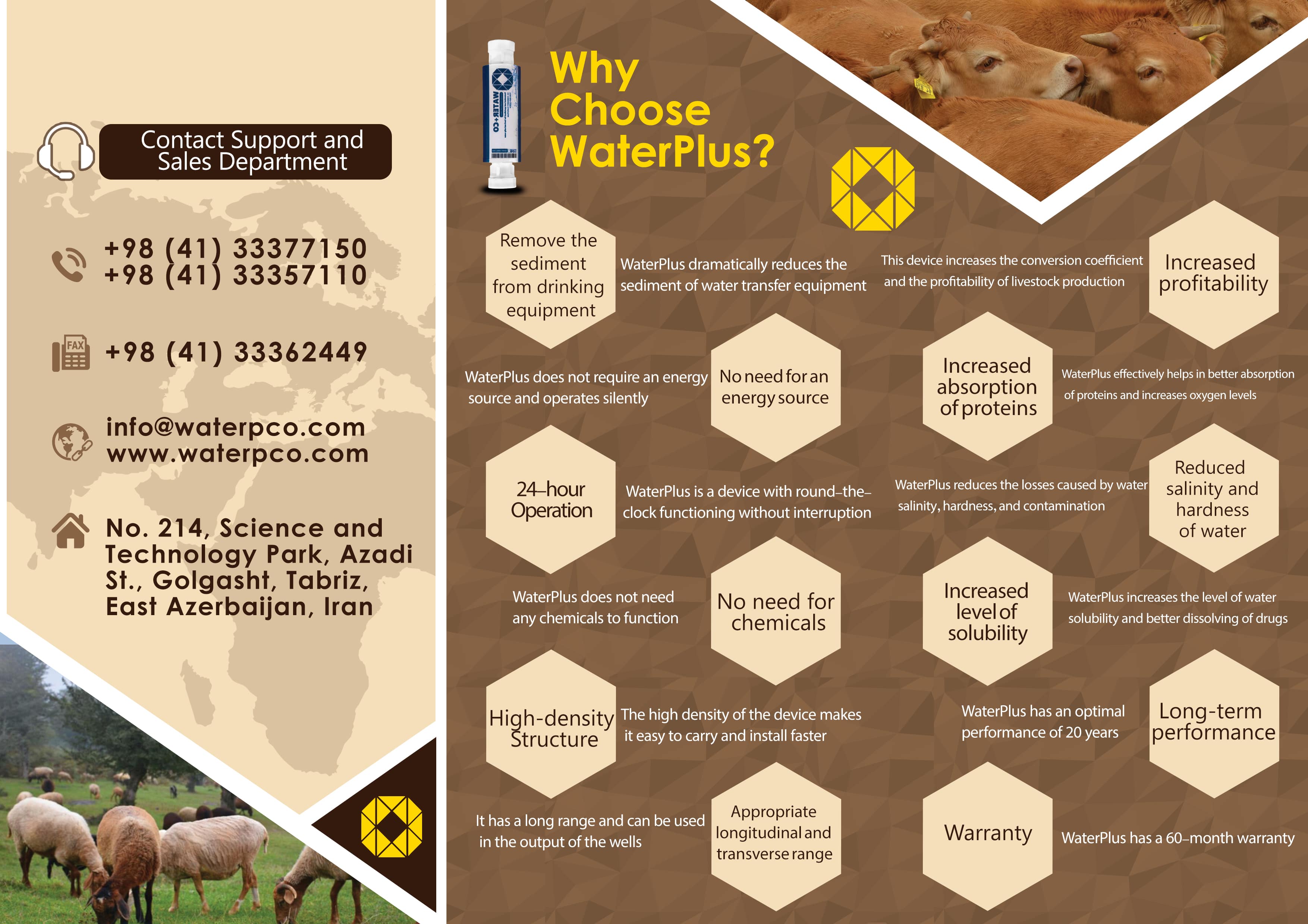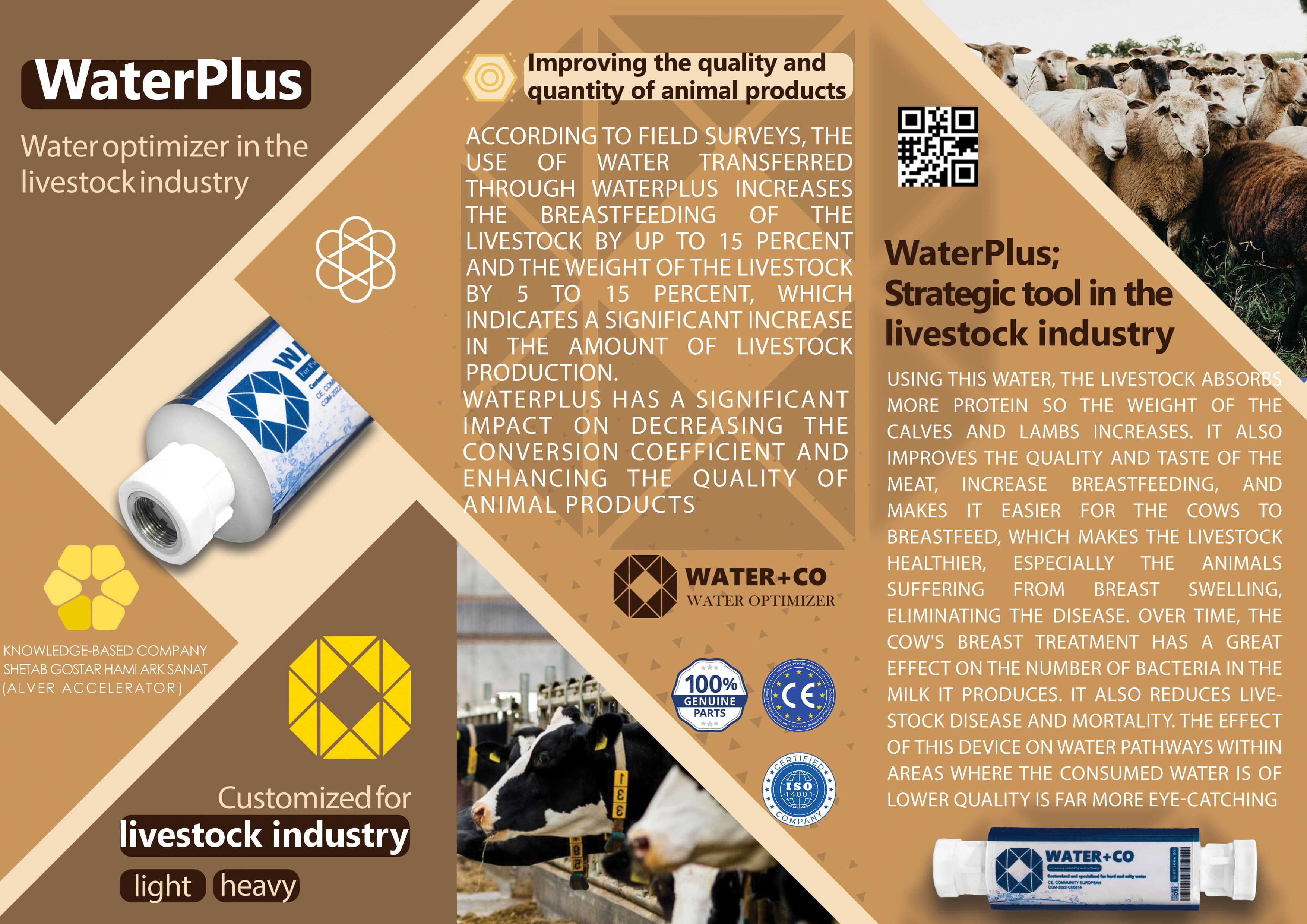Using high-level knowledge and technology; Without changing the main nature of the water consumed, the Waterplus water optimization device has made a tremendous impact in various functional areas, including animal husbandry, poultry and aquatic farming, industry, agriculture, health and health. Considering the wide field of water application and the importance of the quality of this valuable liquid, achieving an optimal structure to improve the quality level and increase its efficiency is a precious success, which now has the ability to be widely supplied at the national level.